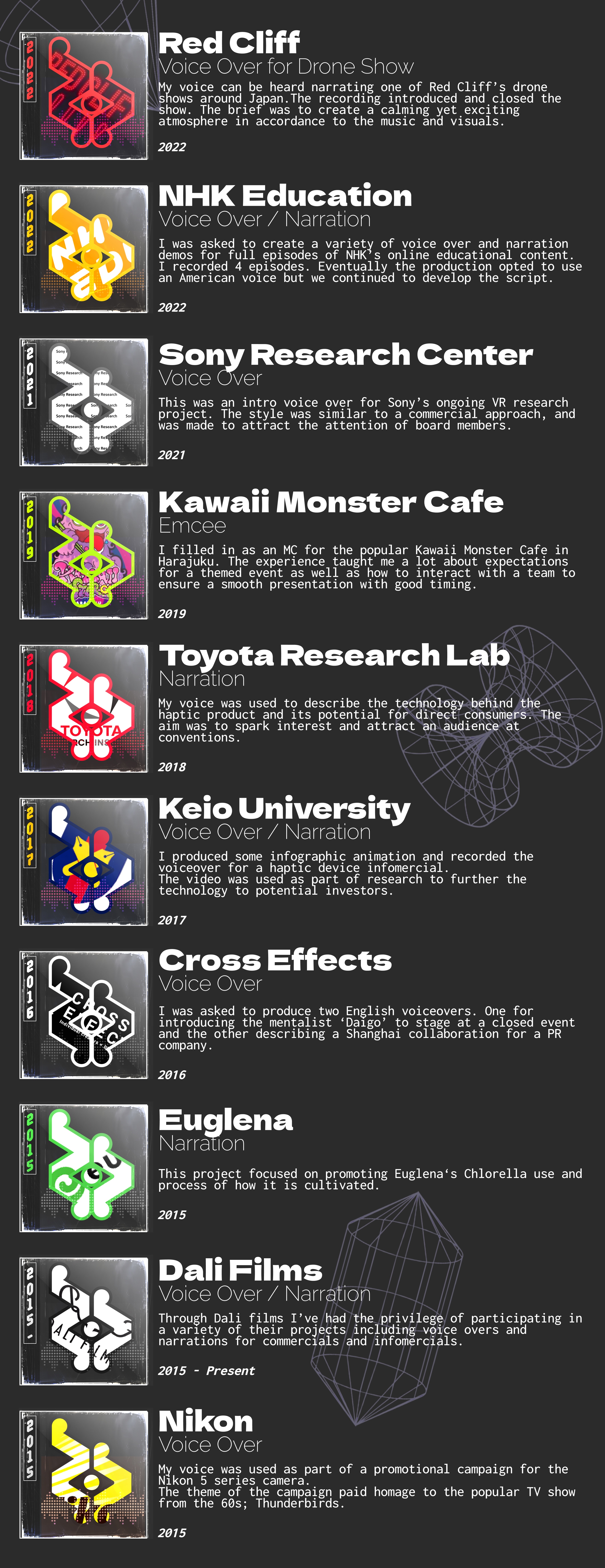View VideoThis was a narration done for 'Haptic Plaster', a bandaid shaped haptic sensor, capable of sending and receiving real-time vibrations. I had the opportunity to record and alter the script and create some of the animation for parts of the video. It was an interesting project as it was shot, recorded, edited and animated within 14 hours at Miraikan, a science and technology event space and museum in Tokyo. With the time constraints, it was an intense but valuable experience.